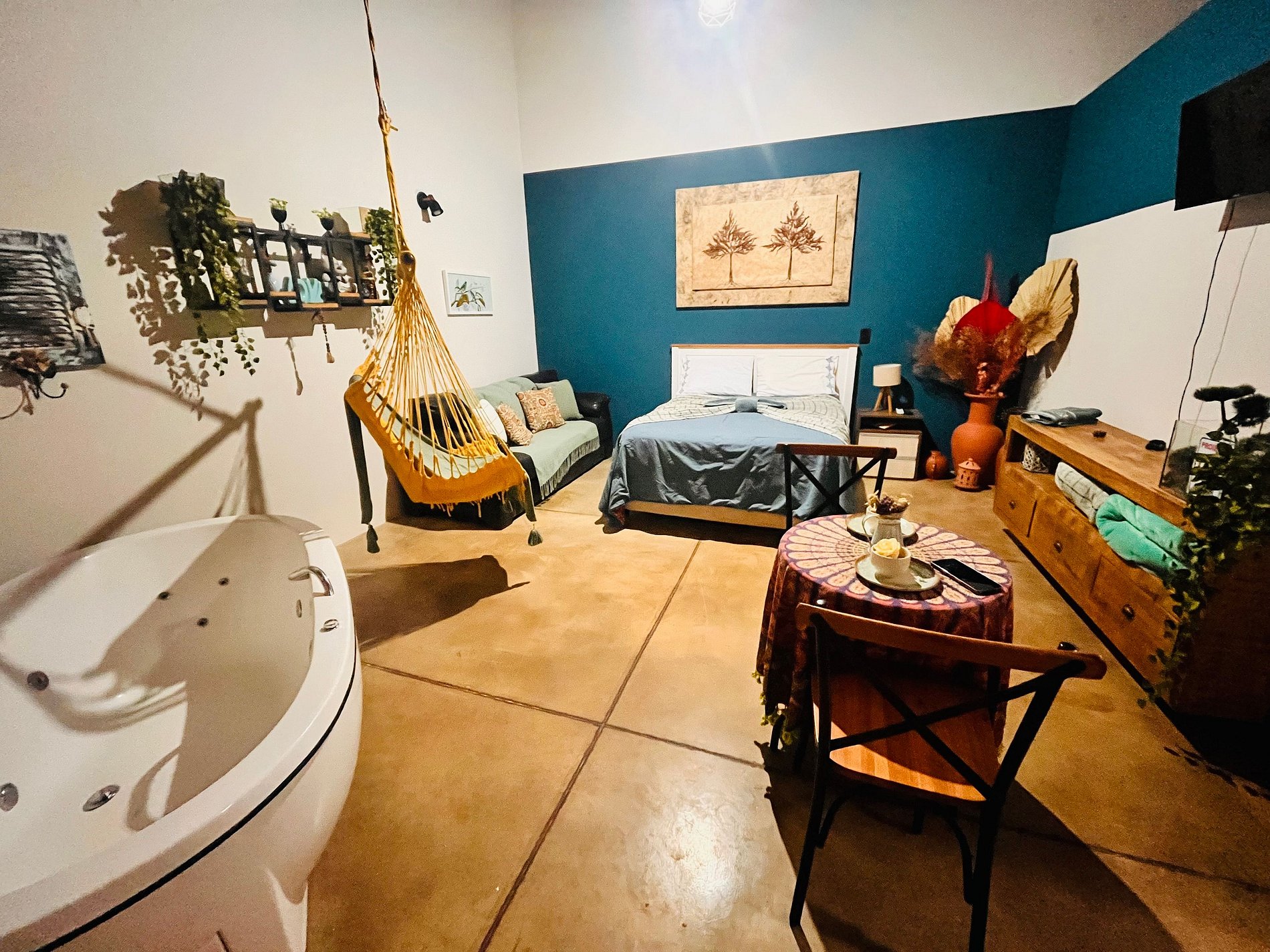 -Jacuzzi Privativa INTERNA c/ Vista Exclusiva: Este é o ponto alto do chalé! A banheira de hidromassagem aquecida fica dentro do Studio e é estrategicamente posicionada para que você relaxe com total privacidade, apreciando a vista tranquila do pasto e da natureza em qualquer clima.