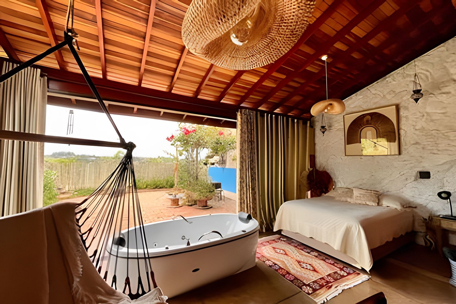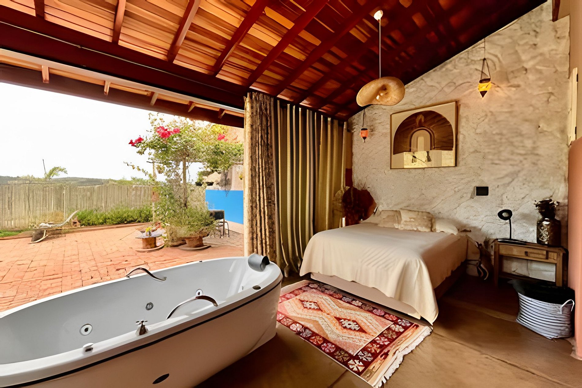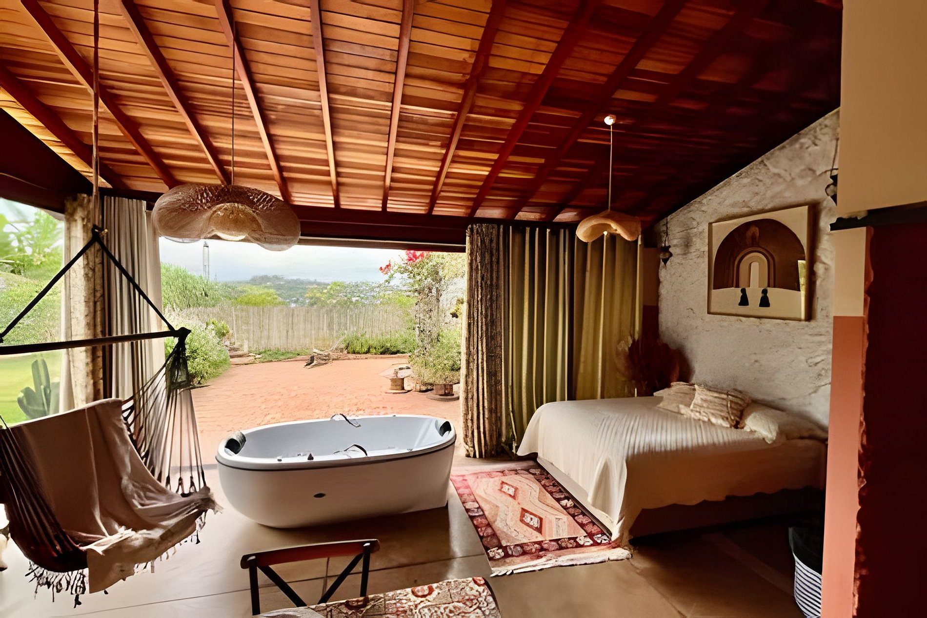 -Jacuzzi Privativa INTERNA c/ Vista Exclusiva: Este é o ponto alto do chalé! A banheira de hidromassagem aquecida fica dentro do Studio e é estrategicamente posicionada para que você relaxe com total privacidade, apreciando a vista tranquila do pasto e da natureza em qualquer clima.