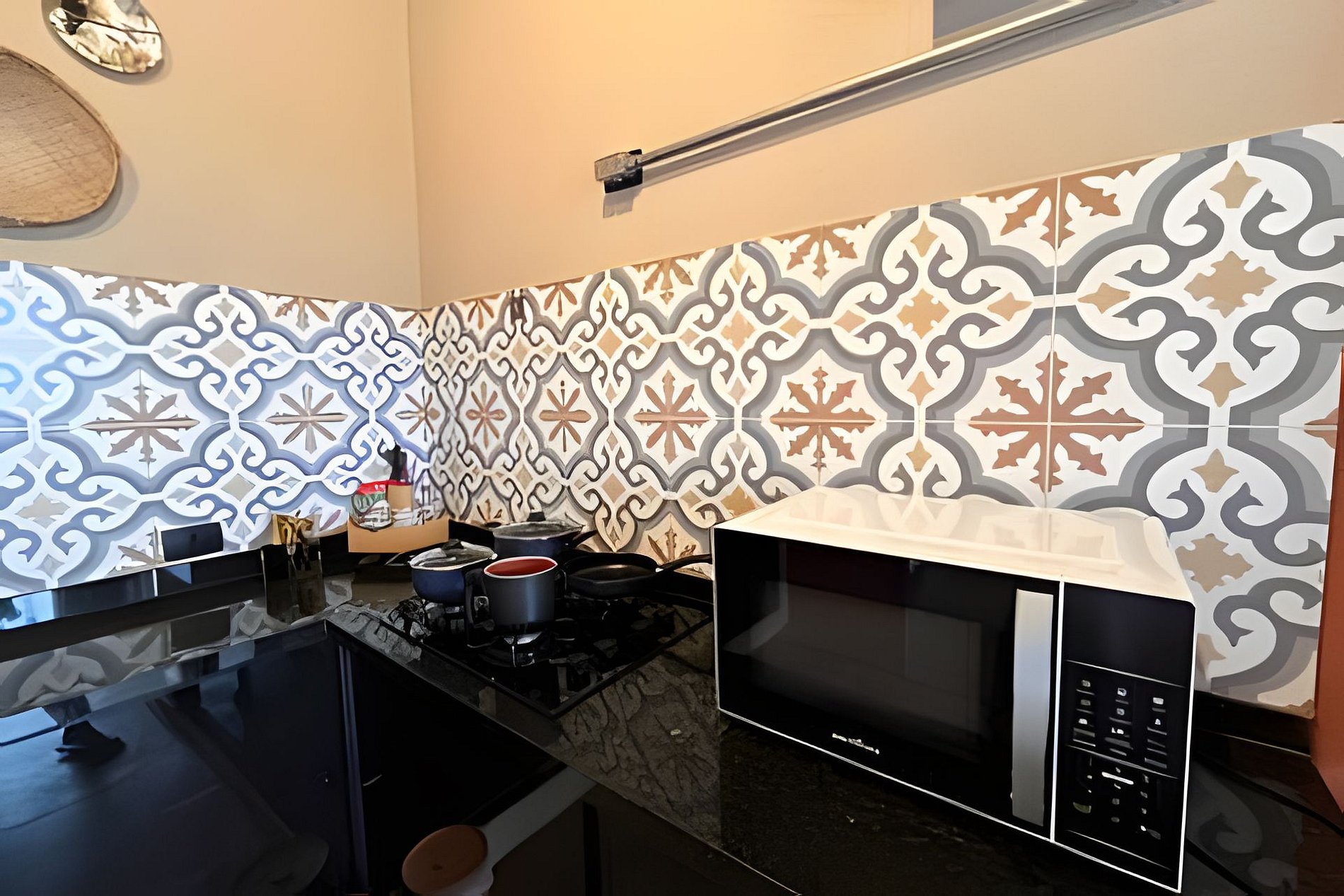 -Cozinha Compacta: Equipada com o essencial para preparar refeições rápidas e lanches (frigobar, micro-ondas, cooktop e utensílios).
